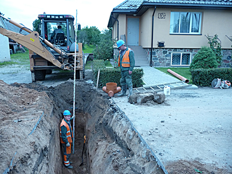 DARBAI: Vandentiekio ir nuotekų tinklus Kolainių gatvėje kloja (iš kairės) ekskavatorininkas Petras Praspaliauskas, vamzdžių klojėjai Kęstutis Leščinskas ir Stasys Eitutis.