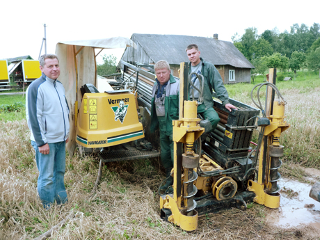KOMUNIKACIJOS: Požeminių komunikacijų gręžimo aparatu dirba (iš kairės) darbų vadovas Alvydas Surblys, operatorius Dainius Jurgaitis ir padėjėjas Darius Eringis.