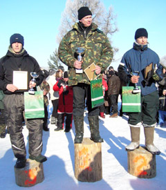NUGALĖTOJAI: Iš varžybų nugalėtojų taures išsivežė (iš kairės): trečią vietą pelnęs Ramūnas Rumbauskas, pirmos vietos laimėtojas Vaidotas Rudys ir antrą vietą užėmęs Džiugas Kavaliauskas.