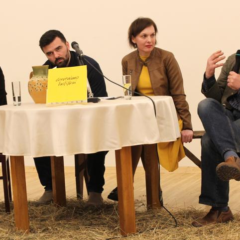 Biržų rajono savivaldybės Jurgio Bielinio viešosios bibliotekos salė tą vakarą tapo dar vieno jaukaus pasikalbėjimo vieta, kur prie senovinio apvalaus stalo, prie senąsias Biržų krašto žmonių bendravimo tradicijas primenančio molinio ąsočio susėdo knygos sudarytojas Kęstutis Pikūnas, Jono Meko mokinys kino režisierius Audrius Stonys, knygos koordinatorė Indra Drevinskaitė ir dešimtmetį su J. Meku bendravęs, kartu dirbęs Arūnas Kulikauskas.