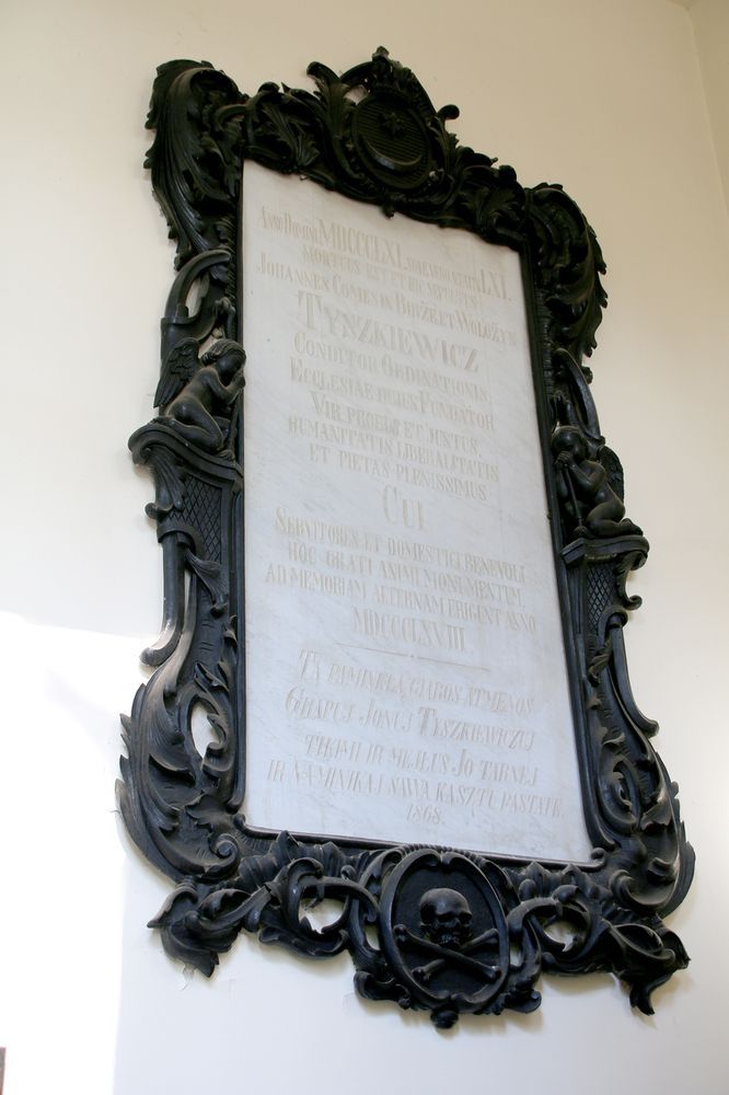 Dar vienas vertingas ir retas dalykas yra lenta, kuri pasitinka kiekvieną tikintįjį vos įžengus pro bažnyčios duris. Mirus Jonui Tiškevičiui, kaip buvo įprasta, vyko iškilminga procesija. Suvažiavę didikai atidavė pagarbą. Kasmet buvo laikomos mišios. Patys valstiečiai, norėdami atsidėkoti didikui už jo šviesumą ir atsidavimą paprastiems žmonėms, užsakė lentą. Įspūdinga tai, kad lentoje aiškiai matomi lietuviški žodžiai. Žinant, kad tuo metu buvo uždrausta spauda ir lietuviškus simbolius pamatyti buvo sunku.