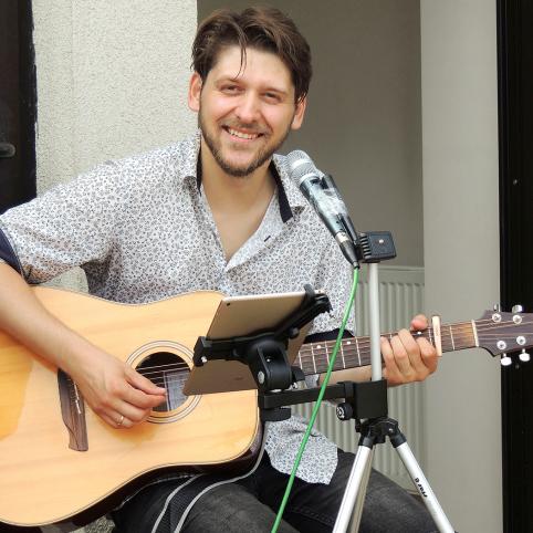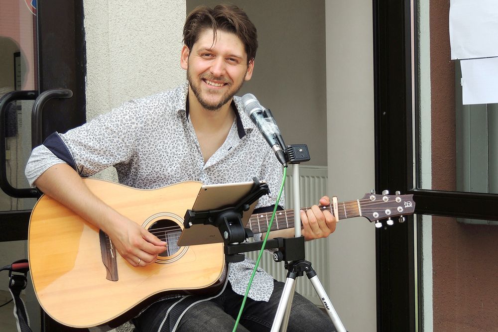 Prie Biržų turizmo informavimo centro dainavo svečias iš Vilniaus – aktorius, dainininkas, muzikos ir tekstų autorius, prodiuseris Justinas Stanislovaitis.