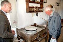 PAMOKYMAI: Šiaulietis, pamatęs muziejuje veikiančias girnas, malūnininko trobos šeimininką muziejininką Julių Vainorių (kairėje) pamokė kai kurių senovėje žinotų gudrybių.