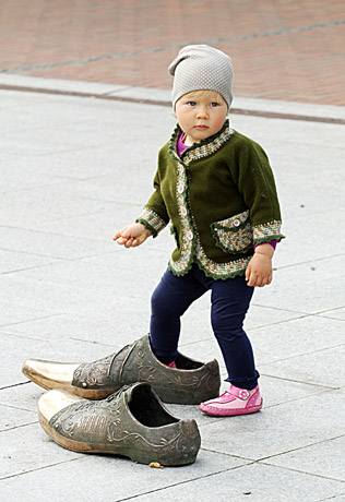 ATRAKCIJA: Mažoji Luknė, mamai neprieštaraujant, įsilipo pasimatuoti „Batus“, kuriuos bulvare „paliko“ skulptorius Martynas Gaubas.