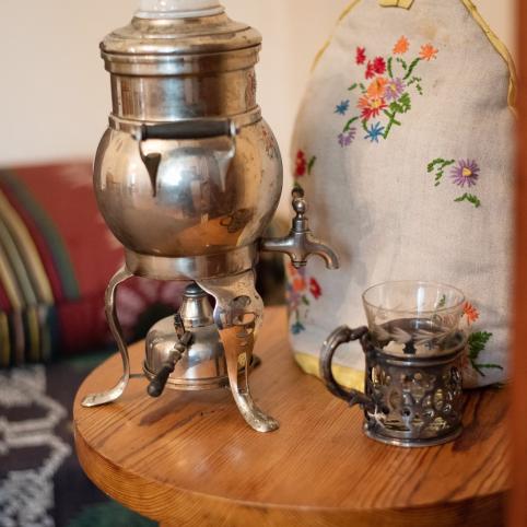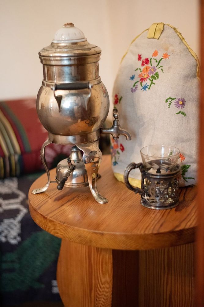 Išlikęs B. Sruogos senovinio stiliaus rašomasis stalas, radijo aparatas, kurį rašytojas atsivežė iš Italijos ir mėgdavo klausytis klasikinės muzikos drauge su žmona, XX a. pirmosios pusės audiniai, garsių lietuvių dailininkų paveikslai, senovinis fotoaparatas su dumpline kamera, kurį šeima įsigijo 1926 m. Juo dažniausiai naudojosi V. Sruogienė. Ji fotografavo šeimos narius, draugus, namo statybą, istorines vietoves. Svetainės puošmena – baldai, sukurti madingo ir itin populiaraus tarpukario dizainerio Jono Prapuolenio rankomis.