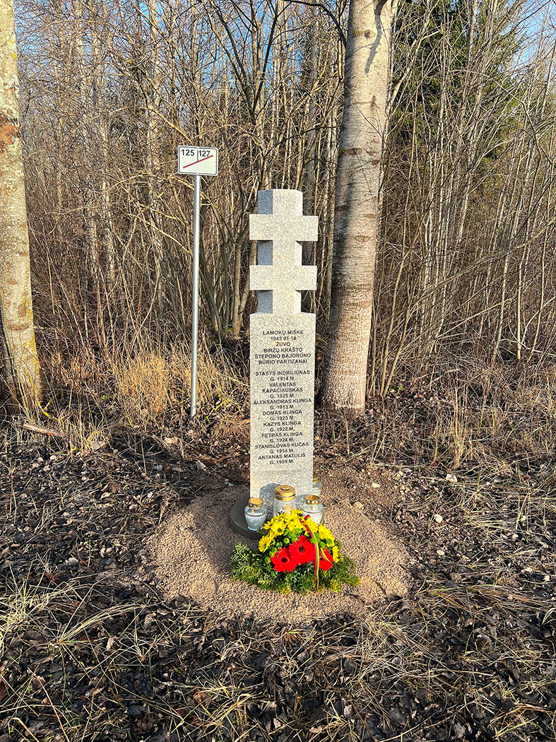 Lietuvos partizanų kautynių ir žūties vietoje, Lamokų miške, prie Lamokėlių kaimo, Gerdas Grytė, kartu su Lietuvos gyventojų genocido ir rezistencijos tyrimo centru, pastatė partizanams skirtą atminimo ženklą.