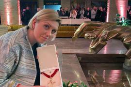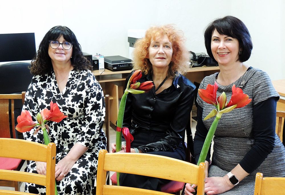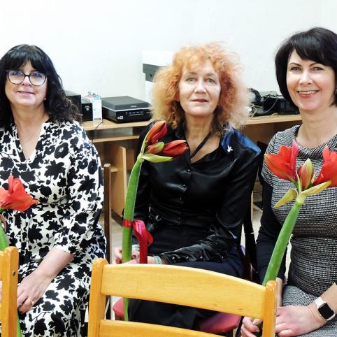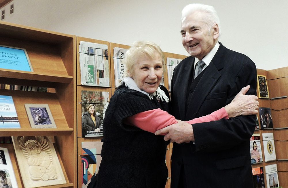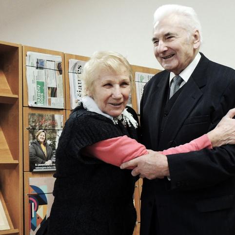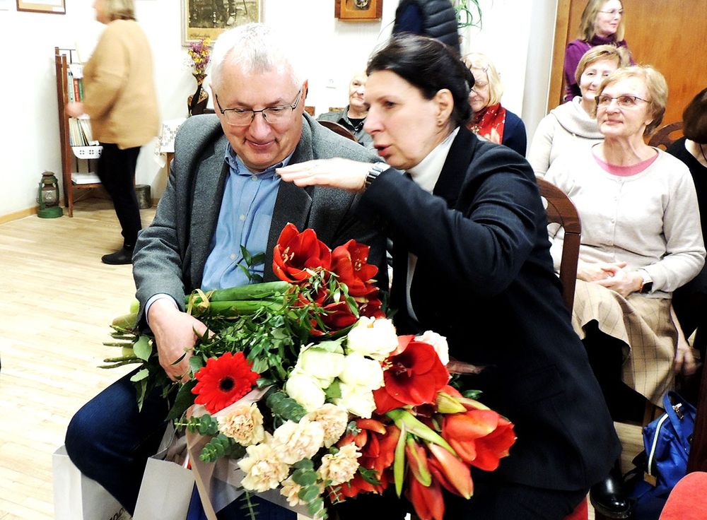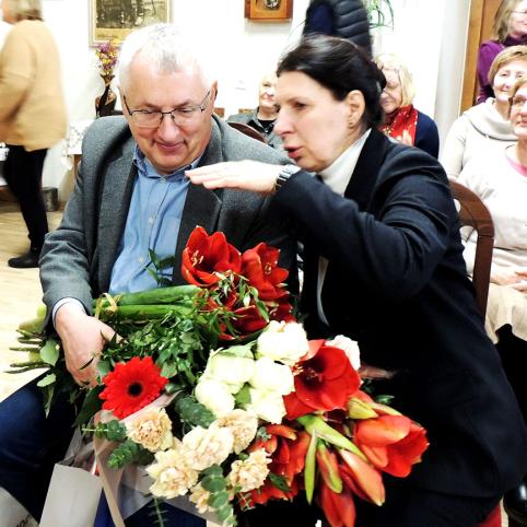 Poetė Rima Tunkūnienė išraiškingai skaito jubiliatui Algirdui Butkevičiui skirtą eilėraštį.