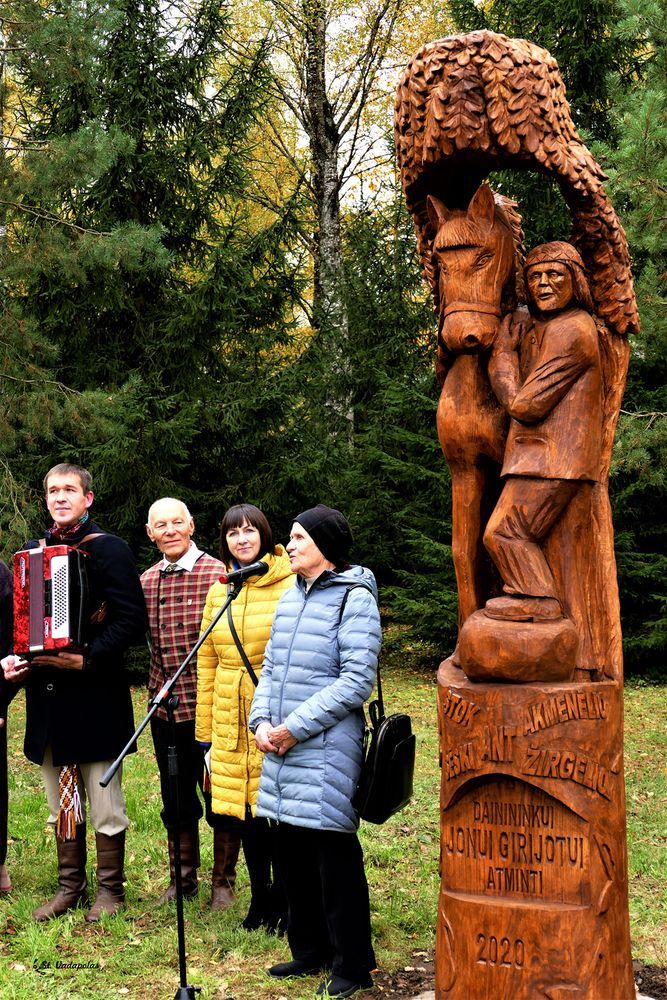 Į J. Girjotui skirtos skulptūros pristatymą iš Vilniaus atvažiavo Jono žmona Salomėja, sūnai Jonas ir Antanas, anūkai. Iš Kėdainių atvyko Jono sesuo Adelė. Šis dailus meno kūrinys atsirado Vabalninko krašto kultūros ir istorijos fondo rūpesčiu, tad renginį vedė fondo pirmininkė Dalia Baltrušaitienė. Ąžuole išrašyti žodžiai „Stok ant akmenėlio“. Pasak Dalios, tai buvo viena mėgstamiausių Jono Girijoto dainų. Vabalninko kultūros namų ansamblis “Saulala“, vadovaujamas Petro Matulio, šią dainą atliko, o J. Girijoto žmona Salomėja nurišo nuo stogastulpio juostą. „Saulala“ padainavo dar keletą Jono mėgtų dainų.