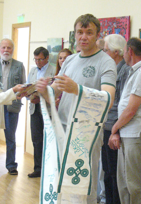 DOVANA: Plenero vadovas Sigitas Laurinavičius organizatoriams paliko prisiminimą – juostas su Žiemgalos plenero simboliu ir plenero dalyvių bei svečių parašais.
