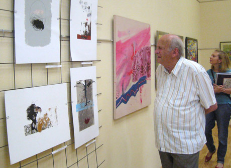 PARODA: Menotyrininkas, dailininkas Vytenis Rimkus apžiūri kolegų plenero dalyvių darbų parodą Joniškio kultūros centre.