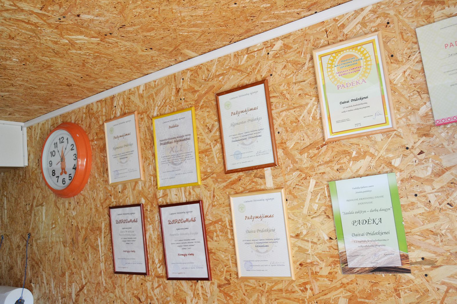 Vie­na­me kam­ba­ry­je – sve­čių prii­ma­ma­sis. Ja­me dip­lo­mai iš bi­ti­nin­kys­tės šven­čių, mu­gių. Kai­my­nų svei­ki­ni­mai ir lin­kė­ji­mai. Ant­ro­ji pa­tal­pa – Al­gi­man­to vie­nu­tė. Čia jis su­ka me­dų. Ty­liai. Kant­riai. Ra­miai. Al­gi­man­tas pri­su­ka 1,5 to­nos me­daus.