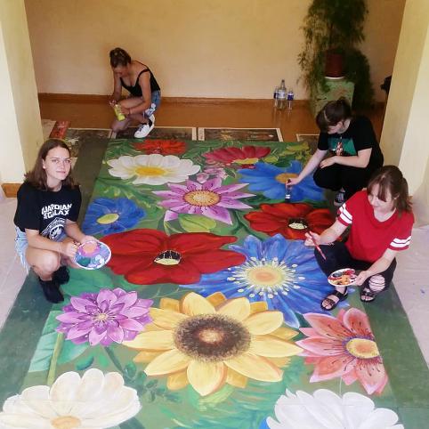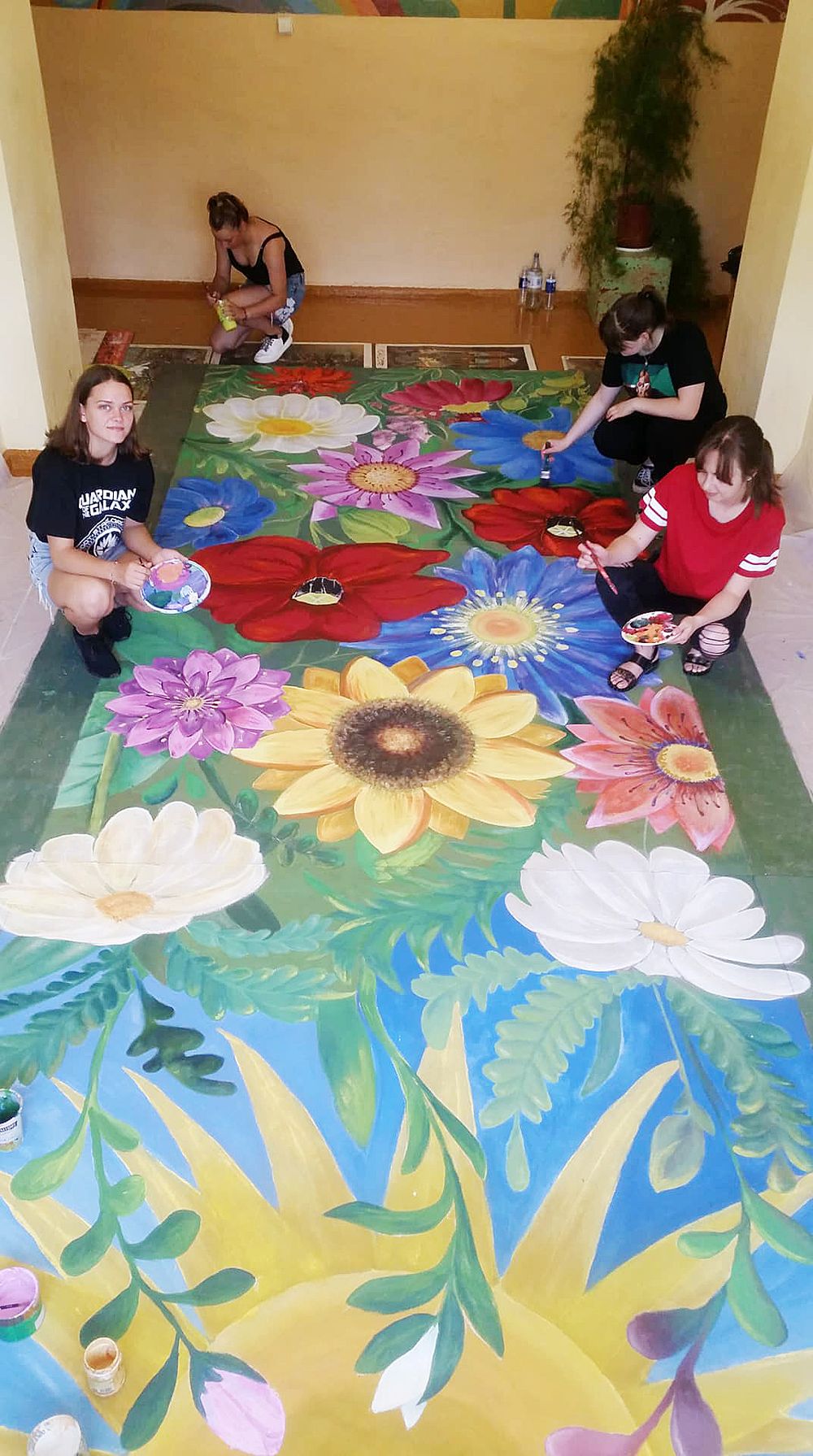 Anot mokytojos, pagal turimus eskizus pirmiausia kartu su mokiniais piešė piešinį ant geotekstilės, tada tapė akriliniais (vandeniui atspariais) dažais, nutapytą darbą fiksavo laku ir ...sukarpė, kad būtų galima tvirtinti prie laiptų.