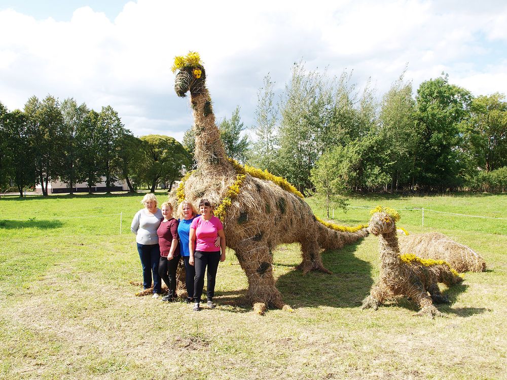 Kur talkininkų rankos, kojos nepasiekė, pasitelkta technika ir kopėčios. Dinozaurai išsirito beveik iš dviejų šieno rulonų. Jų puošybai naudoti žirnikai, geltonoji rykštenė, rudbekijos, serenčiai, jurginai.