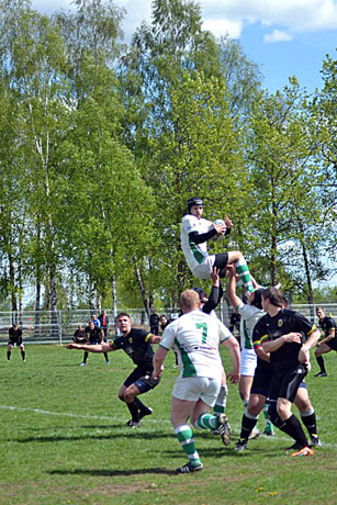 ŠUOLIS: Vilniaus „Geležinio vilko“ regbininkus namuose sutriuškinę „BaltRex-Šiauliai“ turnyro lentelėje šoktelėjo į pirmą vietą. Su kamuoliu – Vaidotas Gaubas.