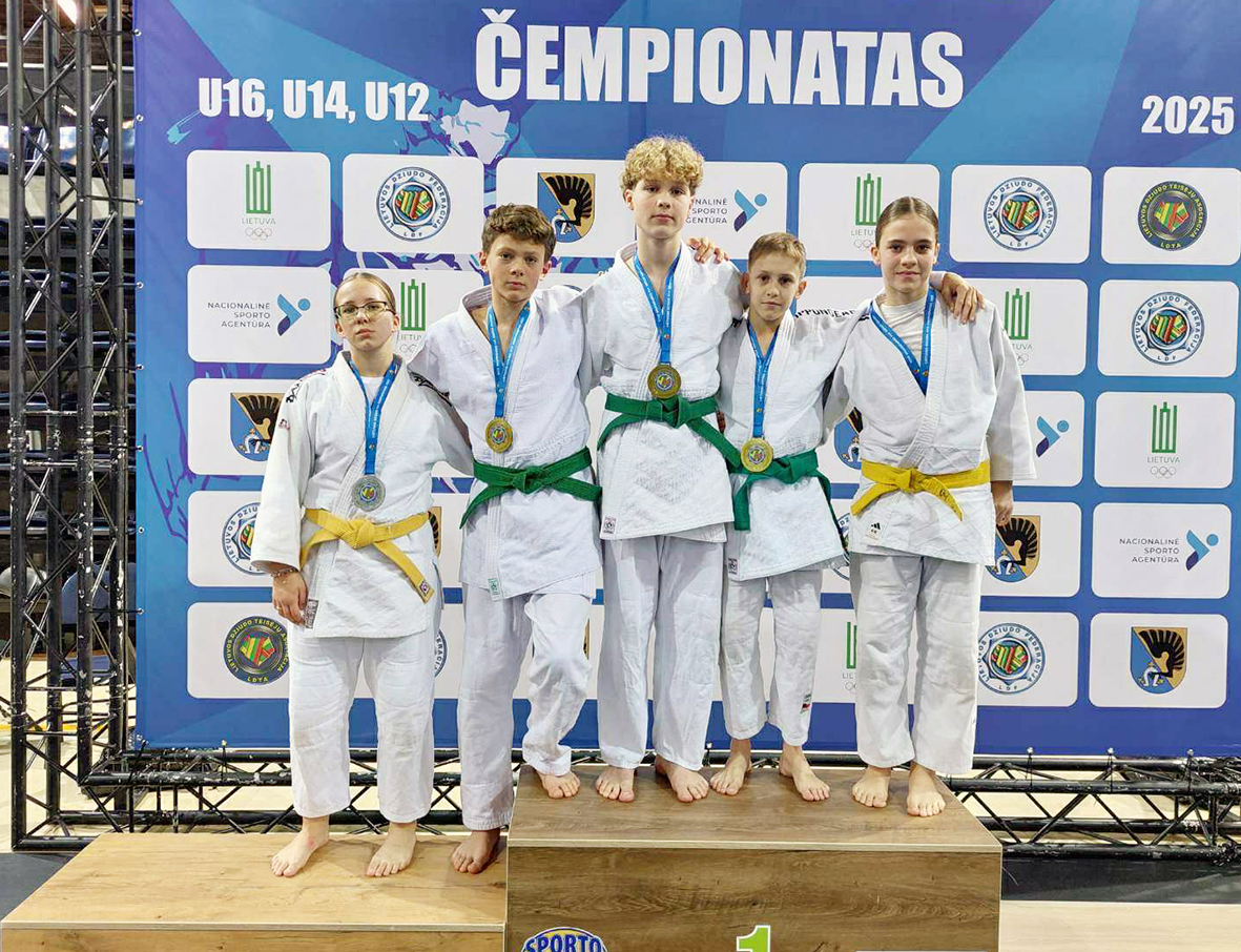 Biržų rajono sporto centro auklėtiniai (iš kairės) Augustė Žvalionytė, Ovidijus Remeika, Dominykas Dermauskas, Domantas Bartuškevičius ir Naomi Skaburskytė lipo ant aukščiausių apdovanojimų pakylos.