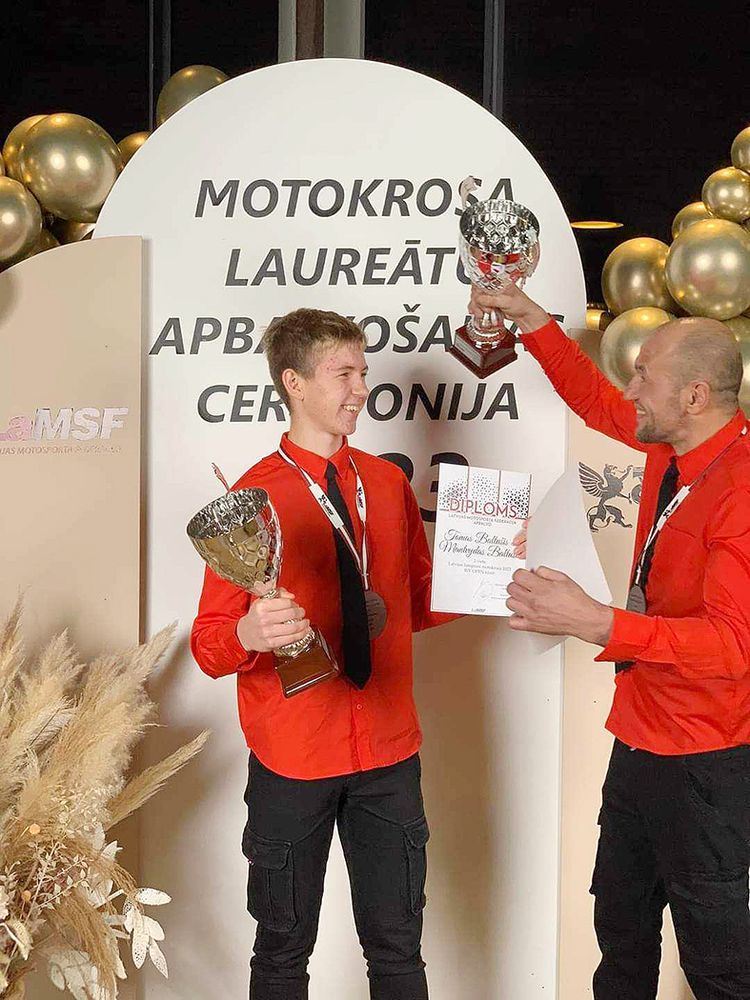 Biržų r. motoklubo „Agaras“ nariai, tėtis ir sūnus – Tomas ir Mantvydas Baltušiai, po paskutinių varžybų Latvijoje į namus parvežė garbingą titulą – iškovotą antrosios vietos taurę Latvijos motokroso 2023 metų čempionate, motociklų su priekaba klasėje.