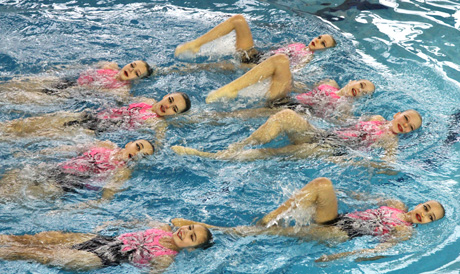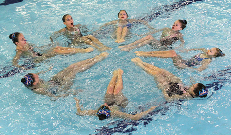 VIEŠNIOS: Dailiojo plaukimo atstovės iš Kaliningrado laisvojoje programoje demonstravo ne tik puikų sinchronišką šokį, bet ir ryškiaspalvius maudymosi kostiumėlius.