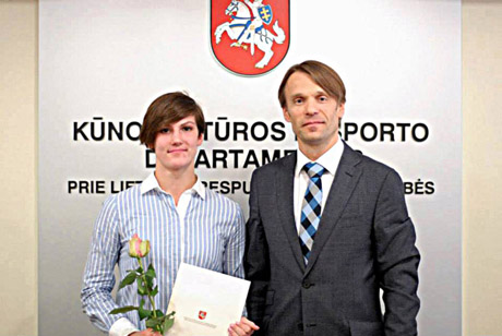 SVEIKINIMAI: Šiaulietę imtynininkę Danutę Domikaitytę su šio sezono puikiais rezultatais ir pasaulio jaunimo imtynių čempionate iškovotu bronzos medaliu pasveikino Kūno kultūros ir sporto departamento vadovas Edis Urbanavičius.