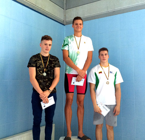 PRI­ZI­NIN­KAI: Šiau­lių 780 me­tų ju­bi­lie­jaus pro­ga su­reng­to­se plau­ki­mo var­žy­bo­se pir­mą­ją vie­tą 50 met­rų plau­ki­mo krū­ti­ne rung­ty­je iš­ko­vo­jo Val­das Aba­likš­ta (vi­du­ry­je), ant­rą­ją – Lu­kas Staš­kus (pir­mas iš kai­rės), o tre­čią­ją – Pau­lius La­šas.