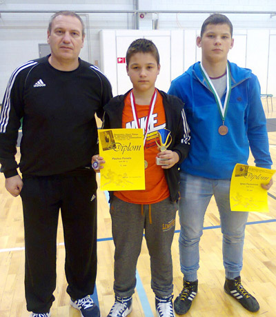 LAI­MĖ­TO­JAI: Jo­niš­kie­tis (iš kai­rės) tre­ne­ris Ry­tis Ker­šys ga­li di­džiuo­tis jau­nų­jų spor­ti­nin­kų Pau­liaus Po­ne­lio ir Ig­no Pau­la­vi­čiaus tarp­tau­ti­nia­me tur­ny­re iš­ko­vo­tais auk­so bei bron­zos me­da­liais.