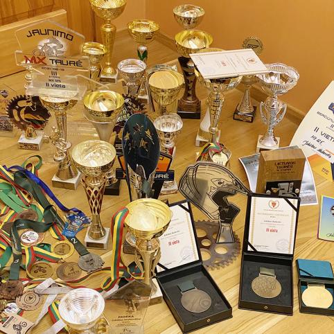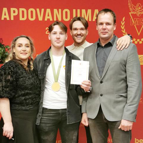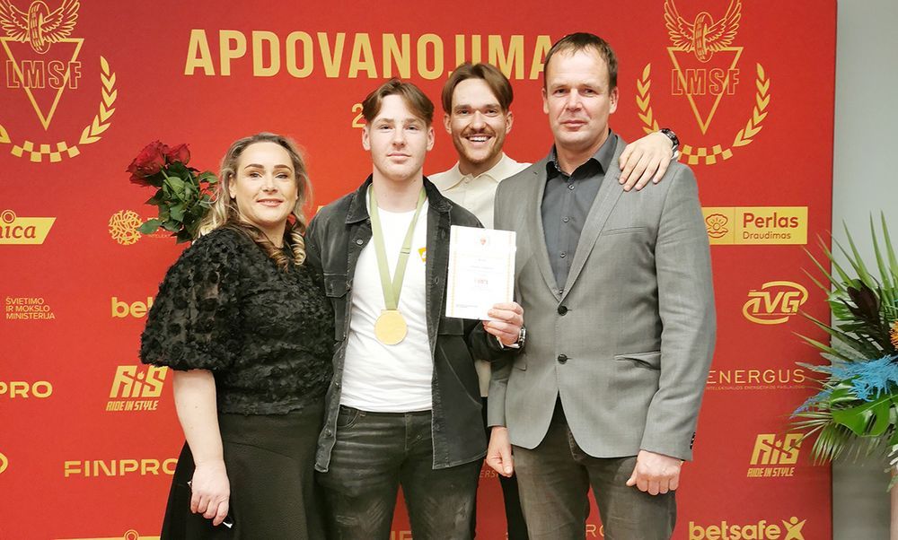Biržietis Jokūbas Skeberdis tapo šių metų Lietuvos motokroso 125cc klasės čempionu ir įsiamžino su tėvais bei treneriu.