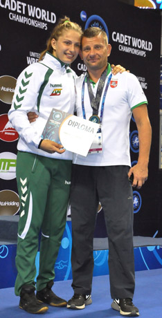 LAIMĖJIMAS: Kamilė Gaučaitė pasaulio jaunių imtynių čempionate iškovojo trečiąją vietą. Auklėtinės laimėjimu džiaugiasi treneris Aivaras Kaselis.