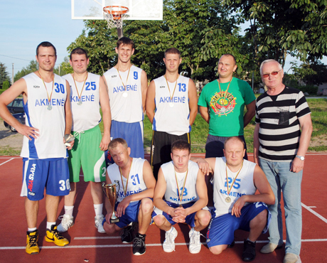 KOMANDA: Akmenės seniūnas Jonas Katauskis (dešinėje) pasveikino geriausioje krepšinio turnyro komandoje „Avastata“ žaidusius S. Momkauską (antroje eilėje iš kairės), L. Balčiūną, A. Bertašių, E. Radionovą, S. Kareivą, A. Bijanskį (pirmoje eilėje iš kairės), V. Seniūną, R. Mockų.