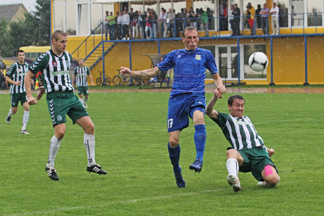 DID­VY­RIS: „Žal­gi­rio“ fut­bo­li­nin­kas And­rius Sker­la (de­ši­nė­je) ta­po ma­čo su „Kruo­ja“ did­vy­riu. Jis ne tik pa­ti­ki­mai gy­nė­si, bet ir pel­nė įvar­tį. A. Sker­la stab­do ak­ty­viai žai­du­sį ir grės­mę po stan­dar­ti­nių si­tua­ci­jų kė­lu­sį Gvi­dą Juš­ką.