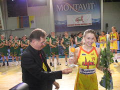 NAUDINGIAUSIA: Naudingiausios žaidėjos titulas atiteko Mantei Kvederavičiūtei, kuriai prizą įteikė radviliškietis Seimo narys Algirdas Butkevičius.