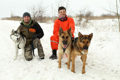 Arvydas Ponelis ir Martynas Rutkus vakarais laukuose su vokiečių aviganiais Loke Šarmu ir Toriu bei Sibiro haskiu Aliaska ruošiasi šunų kinkinių varžyboms.