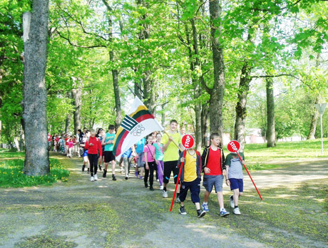 DALYVIAI: Bubių komanda su olimpine vėliava į sporto bazę atėjo pėstute.