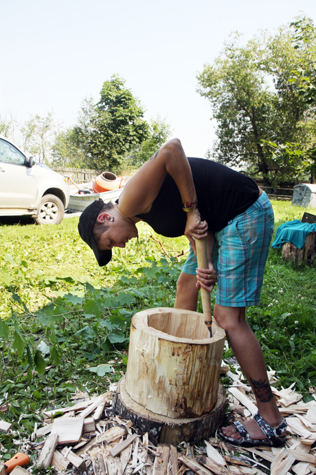 Viena geriausių „Vaiguvos“ dainų vedžiotojų Justina Virvičiūtė iš kelmo skobė medinį būgną ir iš lazdyno suko odą prilaikančius žiedus.