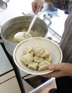 PATIEKALAS: Ponas Rapolas verda pikantiškus koldūnus „Lašiniuočius“, kurie valgomi su raugintais kopūstais.