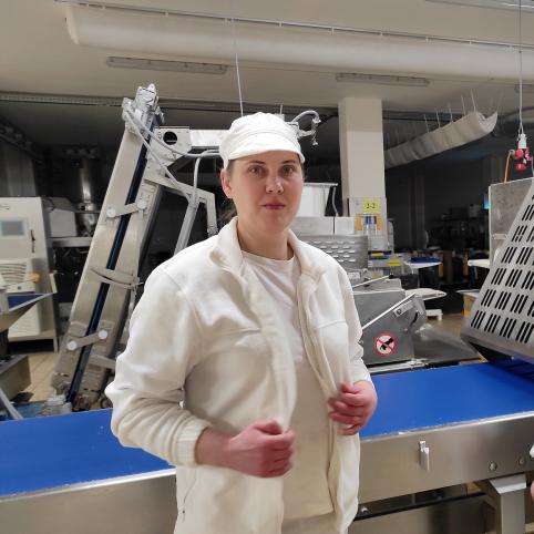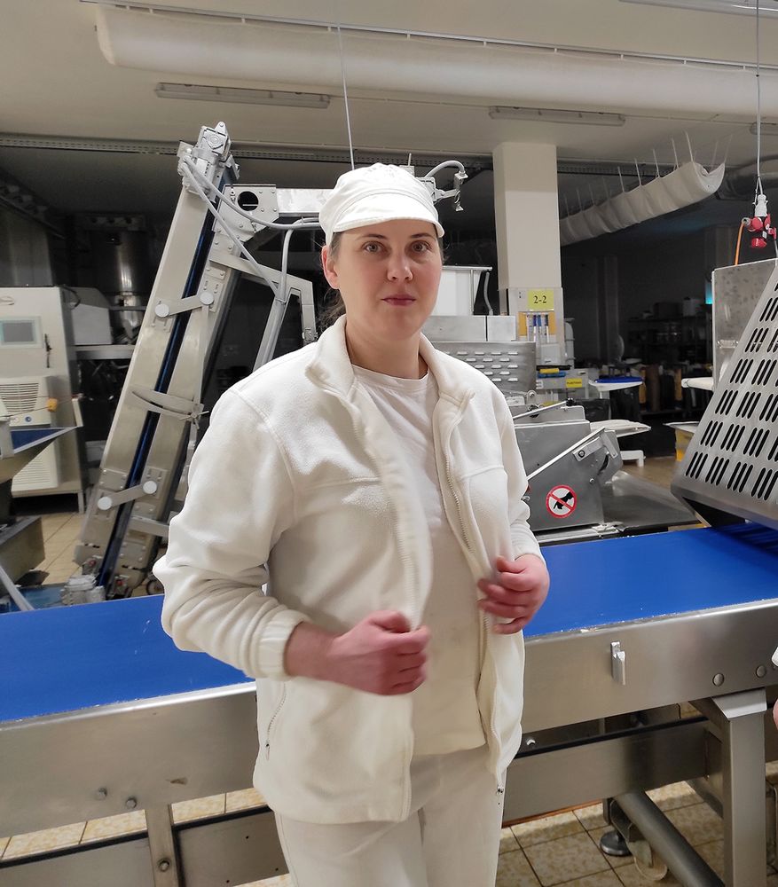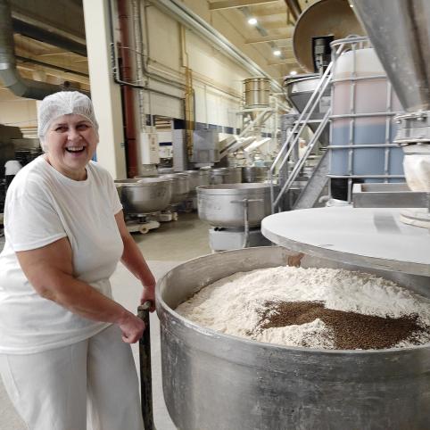 Didžiulį indą su tešla duonai Irena Andriškevičienė stumia taip grakščiai, it stiuardesė žingsniuotų ilgu oro uosto koridoriumi. „Čia mažučiai katilai“,- numoja ranka Irena. Ji yra atsakinga už duonos tešlos paruošimą ir paaiškina, jog procesas yra labai atsakingas, mat kokia tešlos kokybė, tokia ir duona.