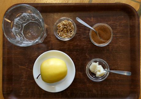 Prireiks (ingriedientų kiekis ir proporcijos – pagal individualų skonį): daigintų avižų, obuolio, medaus, cinamono, vandens.