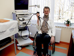 Pakruojo ligoninės gydytojas Gintautas Vilimas kasdien į darbą atvažiuoja automobiliu ir persėdęs į neįgaliojo vežimėlį imasi įprastos veiklos: tiria ligonius gastrointestinaliniu videoskopu, konsultuoja atvykusius į priėmimo skyrių.