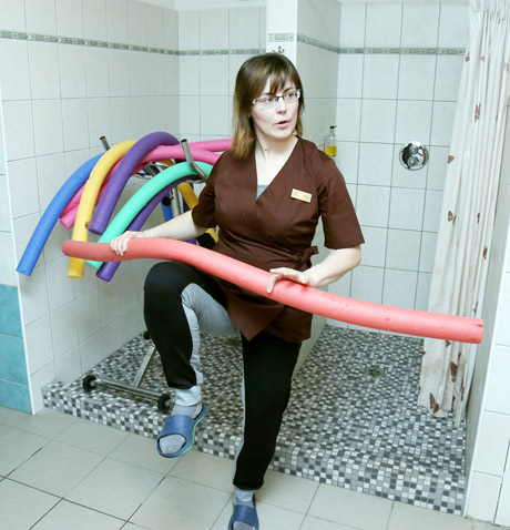 Pratimai rankoms ir pečiams: „makaronas“ suimamas abiem rankomis ir skandinamas. Pratimas atliekamas 10 kartų.