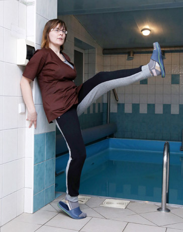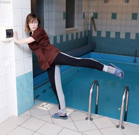 Pratimas sėdmenims: įsikibti rankomis į baseino kraštą. Vieną koją ištiesti atgal, pakelti kiek galima aukščiau. Pratimas atliekamas 10 kartų kiekviena koja.