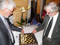 TORTAS: Alfonsas Gudmonas (kairėje) prieš šachmatų lentos su savo broliu dvyniu Dailės akademijos profesorium Jonu Gudmonu. Iš tiesų tai ne šachmatų lenta, o jubiliejaus proga vaikų padovanotas tortas, atspindintis jo pomėgį.