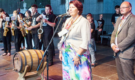 REKLAMA: Festivalio scenoje šalia nepilnamečių muzikantų, kurie vilkėjo marškinėliais su alaus pavadinimu, rajono merė Asta Jasiūnienė ir seniūnas Saulius Margis sakė sveikinimus, atidarė pirmąją „bačką“.