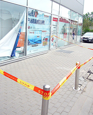 AVARIJA: Vakar Joniškyje į darbą atvykę parduotuvės „Avitela“ darbuotojai rado išdaužtą vitrinos langą, o viduje – sulankstytą lentyną ir nukritusius brangius televizorius, kitą buties techniką.