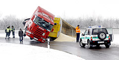 Vienas vilkikas ties vingiu nuvažiavo nuo važiuojamosios dalies ir sustojo laukuose, už keliasdešimties metrų nuo kelio. Antrasis 53 metų Latvijos piliečio vairuojamas vilkikas pusiau nuslydo nuo kelio ir vertėsi ant šono. Nuvirtus šio sunkiasvorio puspriekabei, iš jos išbyrėjo visas vežtas grūdų krovinys.