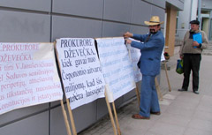 Įvertinęs tai, kad piketuoti prie Prokuratūros pastato draudžia įstatymas, piketuotojas šeduvis Julius Vedeckis atsivežtus plakatus sustatė maždaug už 50 metrų nuo Prokuratūros.