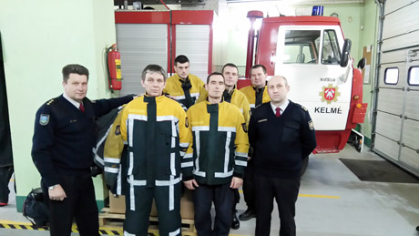 DOVANA: Kalėdinė Nyderlandų dovana – ugniagesio apsauginiai kostiumai – perduoti Kelmės rajono ugniagesių savanorių rinktinės nariams.