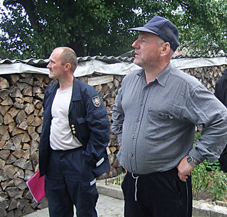 NERIMAS: Sudegusio namo pašonėje gyvenantis Arūnas Pranckevičius (dešinėje): „Gyvename lyg ant parako statinės, tačiau pagalbos iš niekur nesulaukiame“. Šalia – Radviliškio PGT vyresnysis inspektorius Donatas Stakvilevičius.