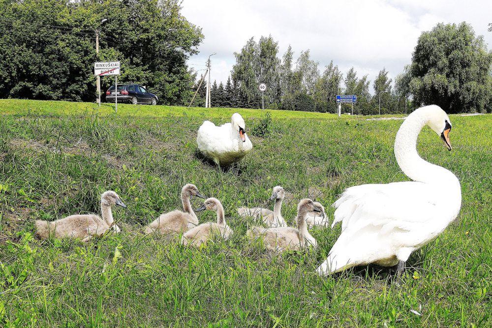Ties Biržų miesto ir Rinkuškių kaimo riba gana drąsiai jaučiasi viena gulbių šeima. Eina į greta esančių sodybų tvenkinėlius. Pabūna, ir patraukia į Širvėnos ežerą. Taip ne kartą gulbės su gulbiukais buvo išėjusios į Biržų-Germaniškio plentą. Stabdė automobilius. Pagal reikalą, saugodamos jauniklius, gulbės stabdydavo net palei plentą taku važiuojančius dviratininkus. Pradžioje gulbių šeimoje buvo septyni jaunikliai. Dabar liko tik šeši.